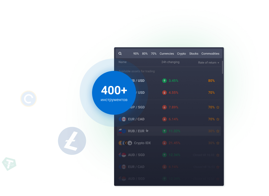 Assets suitable for any trader: currency, commodities, stocks, cryptocurrencies.